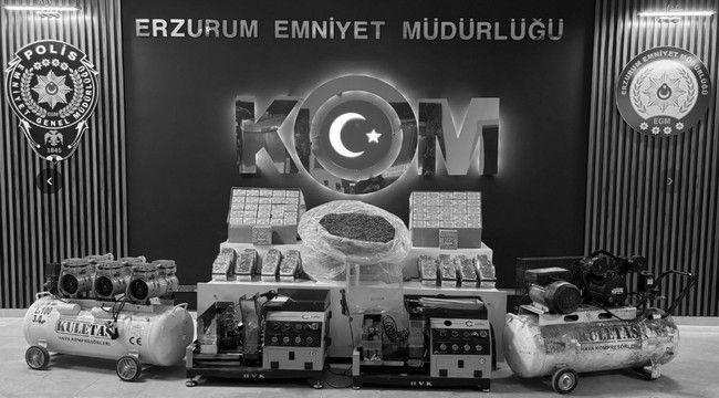 Tortum Cumhuriyet Başsavcılığı koordinesinde Kaçakçılık ve Organize Suçlarla Mücadele Şube Müdürlüğünce, 5607 sayılı Kaçakçılıkla Mücadele Kanunu kapsamında Tortum İlçesinde bir iş yeri ve sigara imalathanesine dönüştürülmüş depo görünümlü yerde yapılan çalışmada; 2 adet otomatik sigara doldurma makinesi, 2 adet kompresör, 5 bin adet doldurulmuş makaron, bin 584 adet gümrük kaçağı sigara sarma kağıdı, 33 bin 800 adet boş makaron, 10 kg açık kıyılmış tütün ve bin 500 adet şeffaf sigara poşeti ele geçirildi.