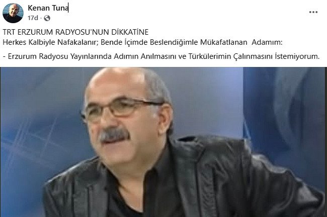 Erzurum Radyosu yayınlarında adının anılmasını ve türkülerinin çalınmamasını isteyen Erzurumlu sanatçı Tuna'nın bu paylaşımı hayli ilgi gördü.