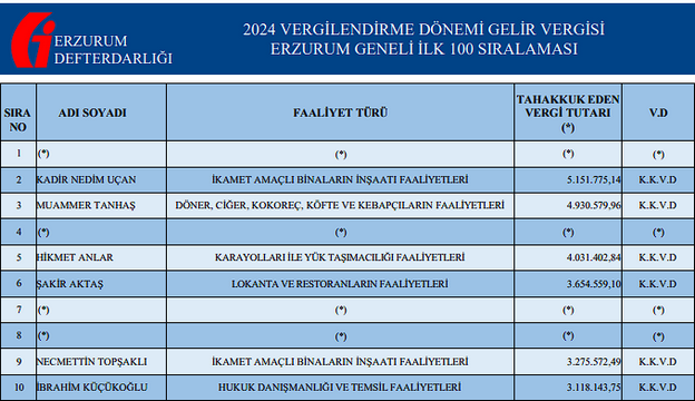 Erzurum'un 2024 yılı vergilendirme dönemine ait en fazla gelir vergisi ve kurumlar vergisi beyan eden mükellefler açıklandı.