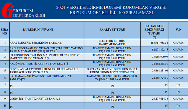 Erzurum Defterdarlığı’nın resmi internet sitesinden ulaşılan listelere göre, Kurumlar Vergisi kategorisinde Erzurum ve bölge illerine elektrik dağıtım hizmeti veren Aras Elektrik Perakende Satış A.Ş ilk sırada yer aldı.