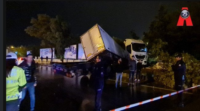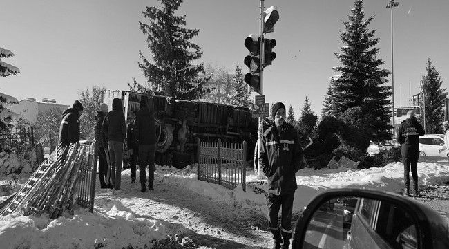 Şehir merkezinde karayollarından gelen TIR, üniversite kavşağında duramayıp kayarak yaya geçide devrildi.