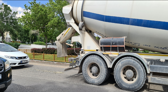 Ağır tonajlı mikser, kırmızı ışıkta duruyor, hele de aracın arkasında tedbirini almamış bıçkın sürücü ani kalkışla hareket ediyorsa, birkaç el arabası betonu arkasında dökerek devam ediyor.